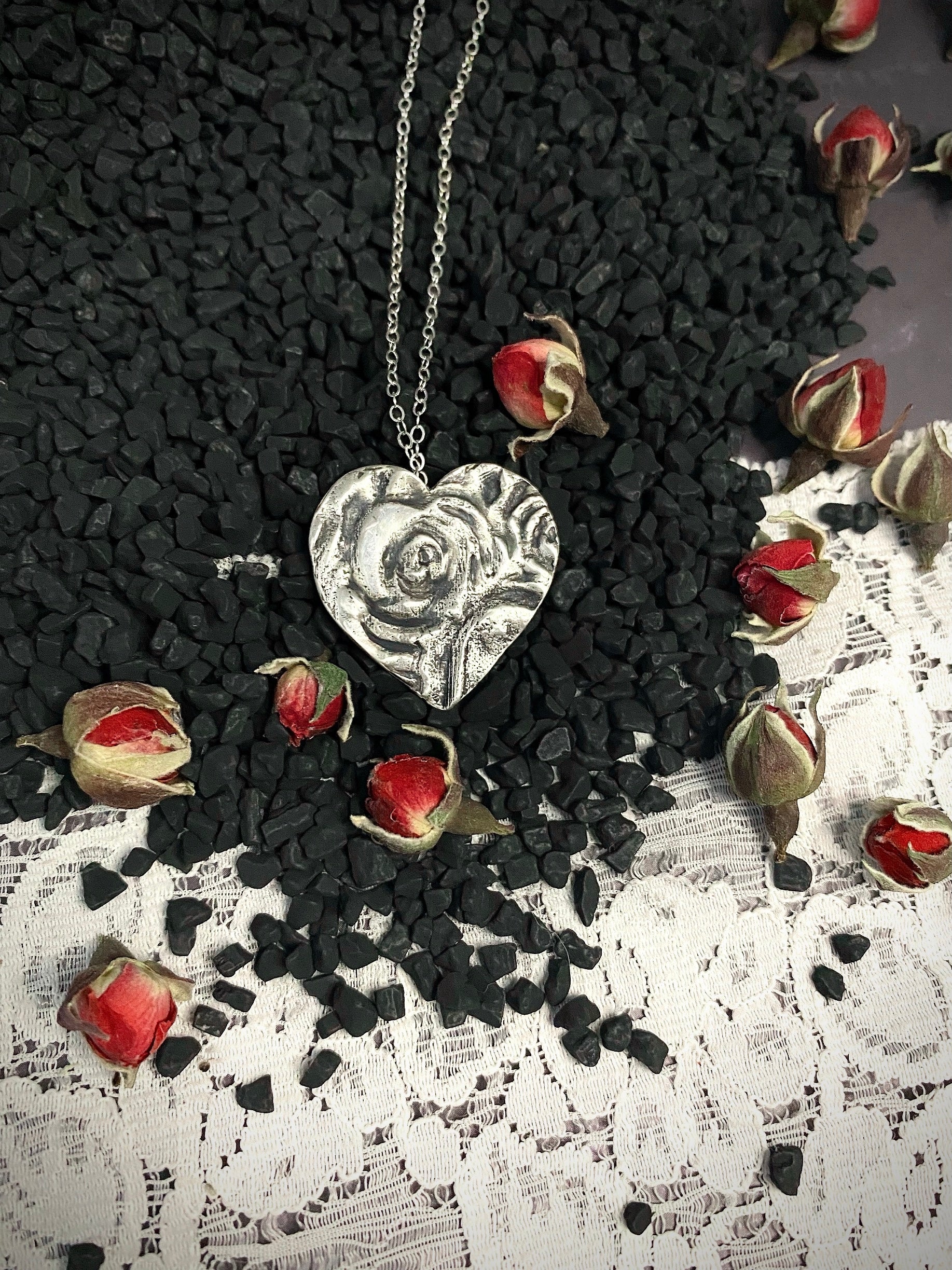 This pendant is handcrafted from fine silver .999 with sterling silver .925 chain and findings. It features a relief of roses and is hand cut into a heart. A sterling loop is attached to the back, which is textured due the material's nature, and features "AN" inscribed into it.