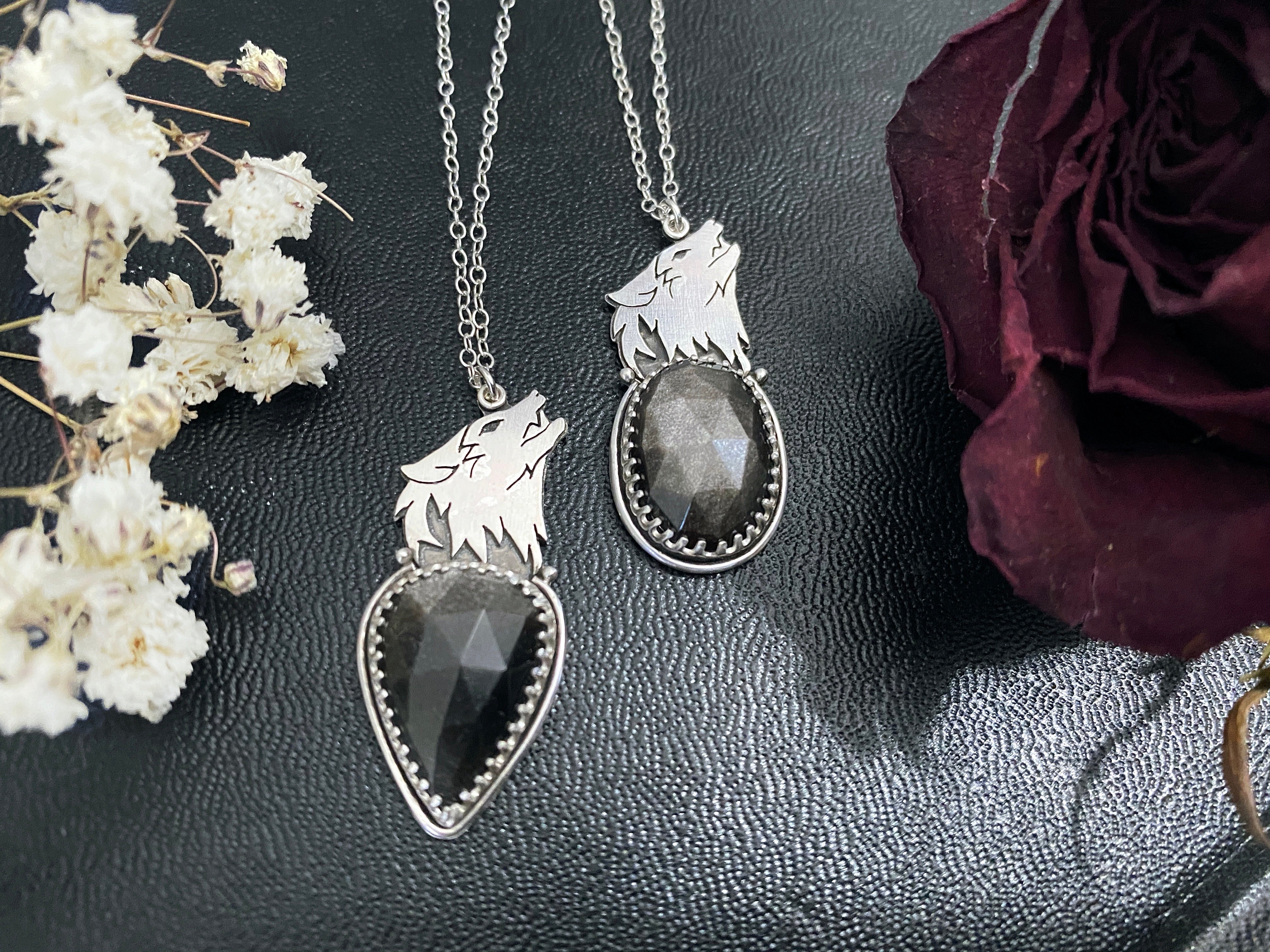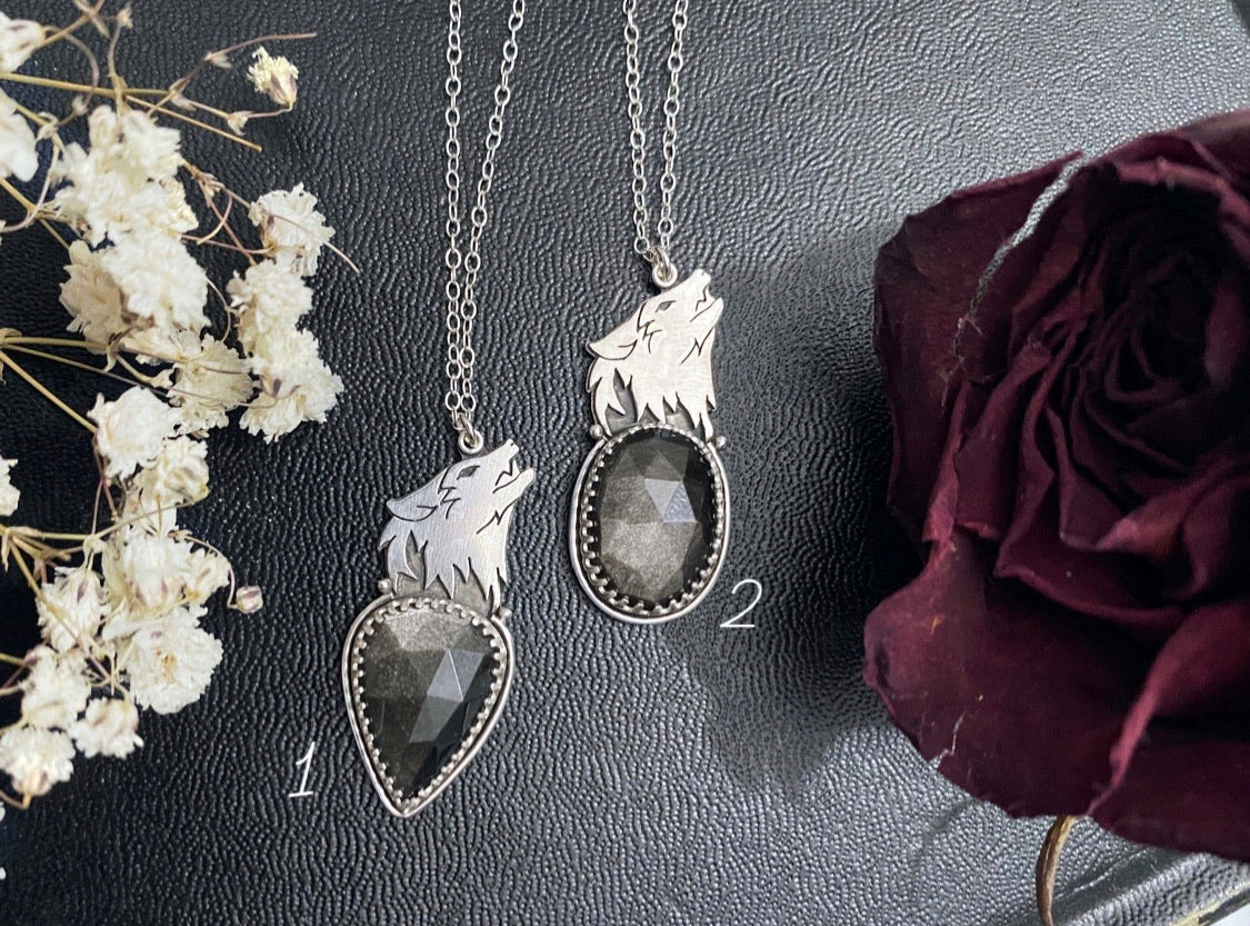 These pendants are handcrafted from sterling silver and features beautiful, faceted silversheen obsidian, and a hand-pierced, howling wolf head.