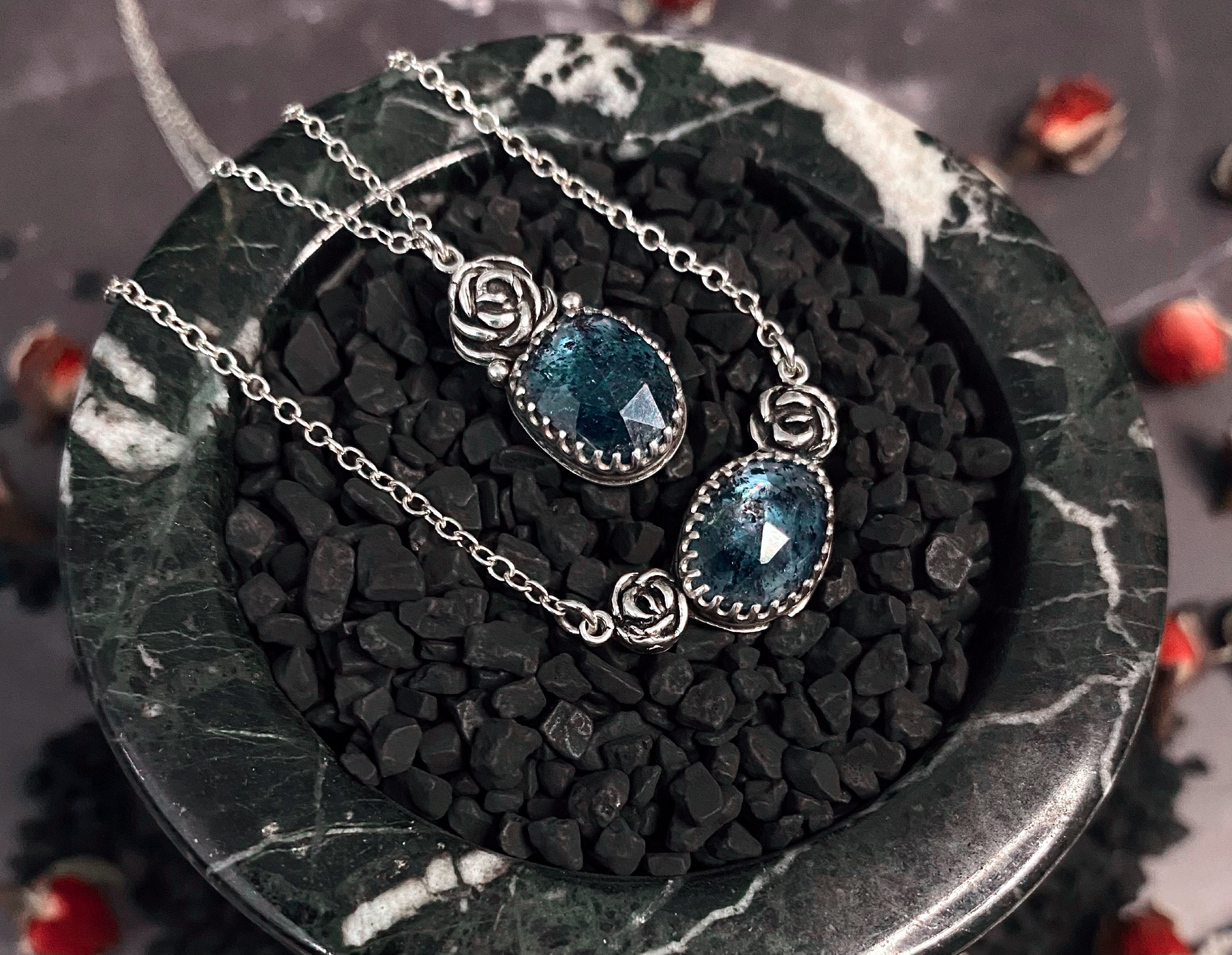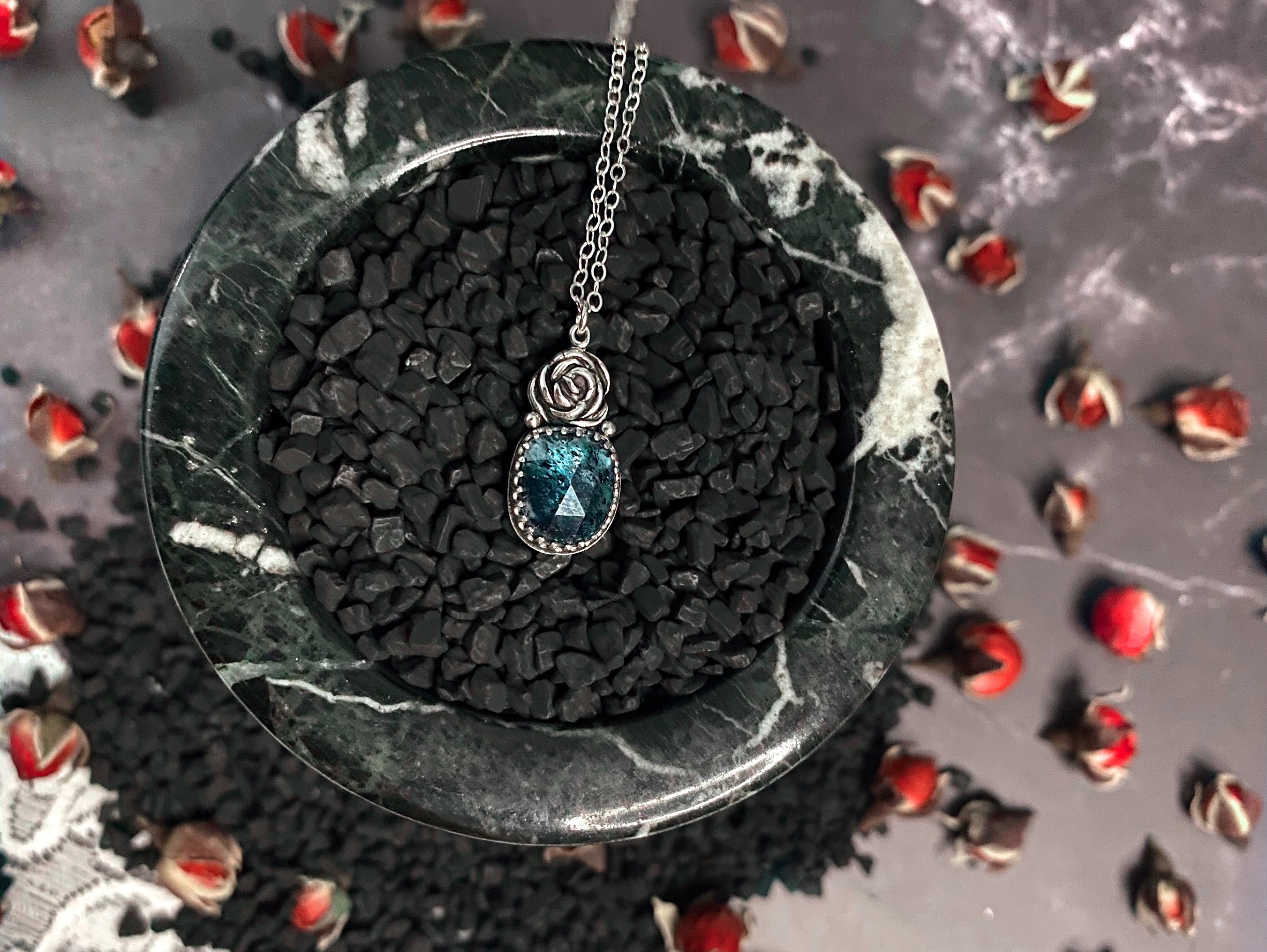 This pendant is handcrafted from fine silver .999 and sterling silver .925. It features faceted teal kyanite set into sterling and topped with a hand-formed fine silver rose bloom. Includes a sterling chain.