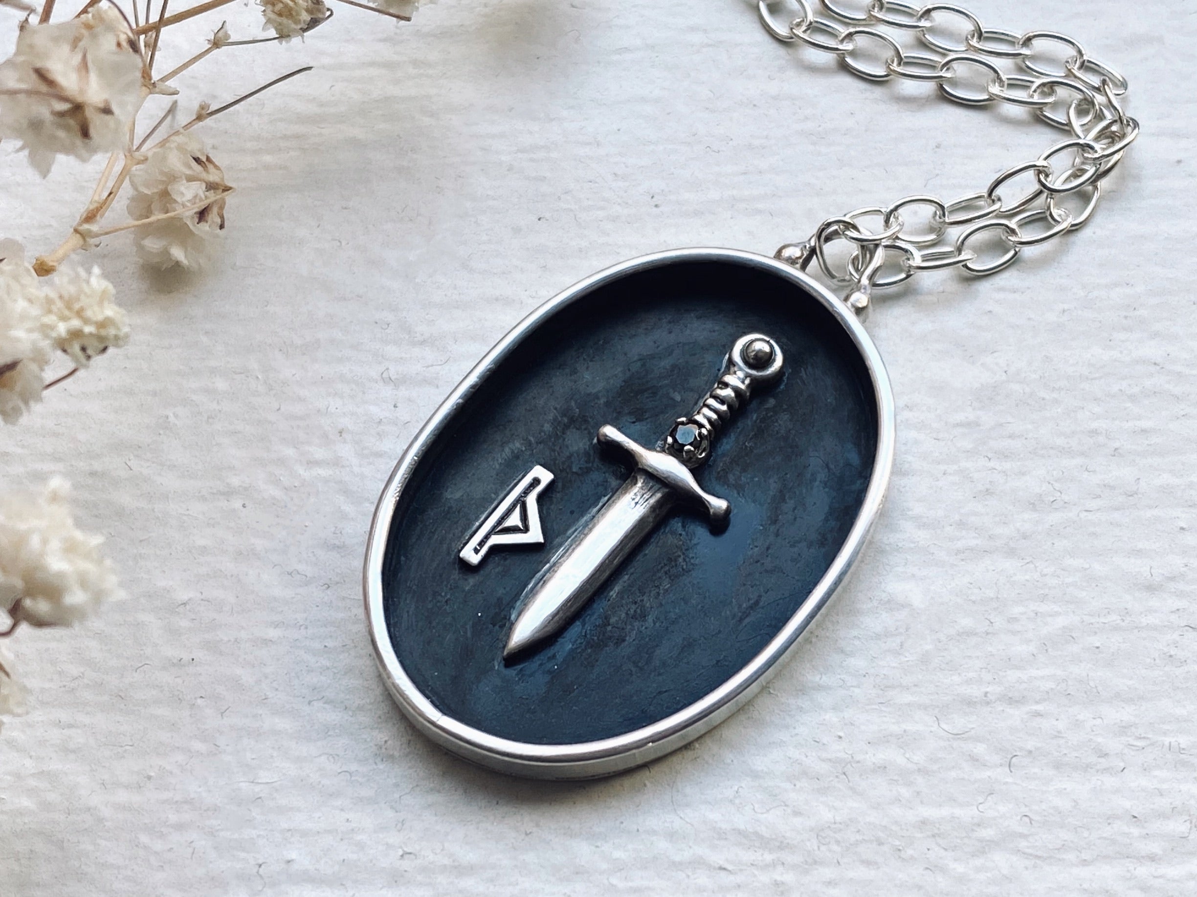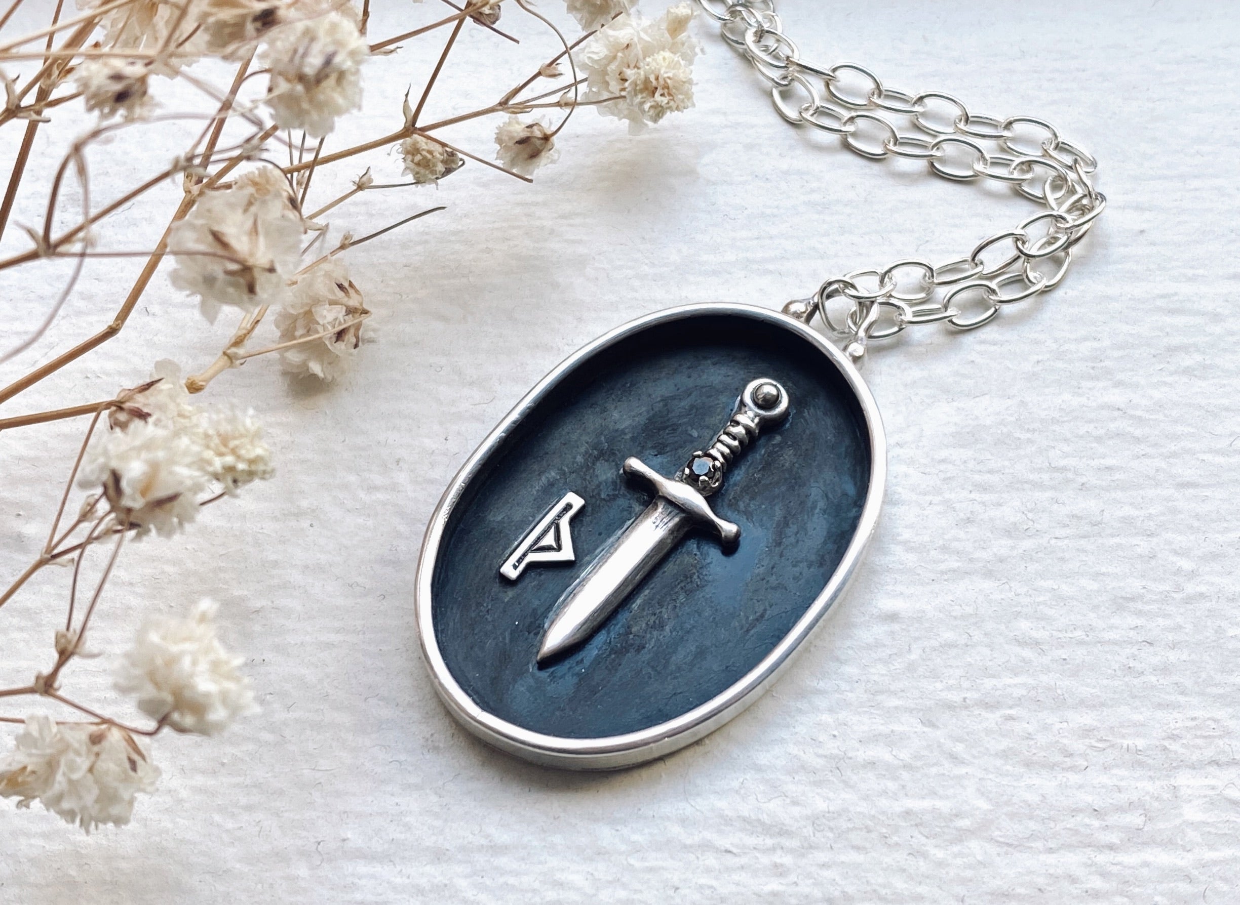 This piece is entirely handcrafted from sterling silver and features a hand-shaped sword (or dagger), jet cubic zirconia stone, a Thurisaz rune, and painstakingly hand-painted blackened details. AG's logo and hallmark are stamped onto the backplate.