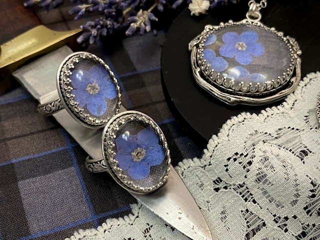 This ring is hand-crafted from sterling silver. You'll find a genuine, pressed forget-me-not bloom sitting atop of snippet of Fraser tartan, and preserved beneath high-domed glass cabochons. They are set into a crown bezel and secured to a sturdy, thistle band.