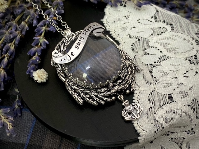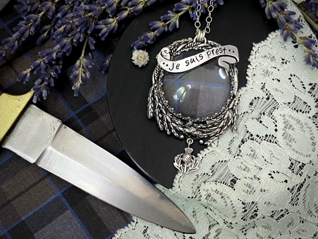 An ode to the dream that is James Alexander Malcolm Mackenzie Fraser, this necklace is crafted entirely in sterling silver. A swatch of Fraser tartan is preserved beneath a glass cabochon and set into a crown bezel. Sprigs of evergreen, twisted rope, cast twig, thistle, and a banner featuring the Fraser motto "Je suis prest", French for "I am ready", adorn the front. Hand-stamped into the backplate can be found: