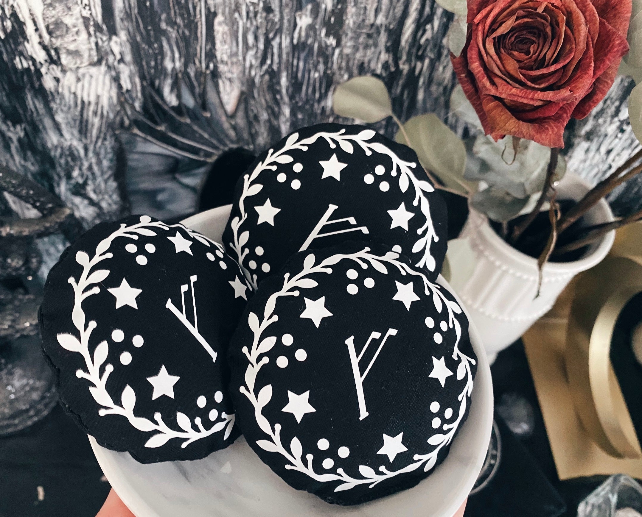 Freyja’s rune, Fehu, sits center of a wreath of leaves and stars. Pairs beautifully with our Freyja protection pet tag!