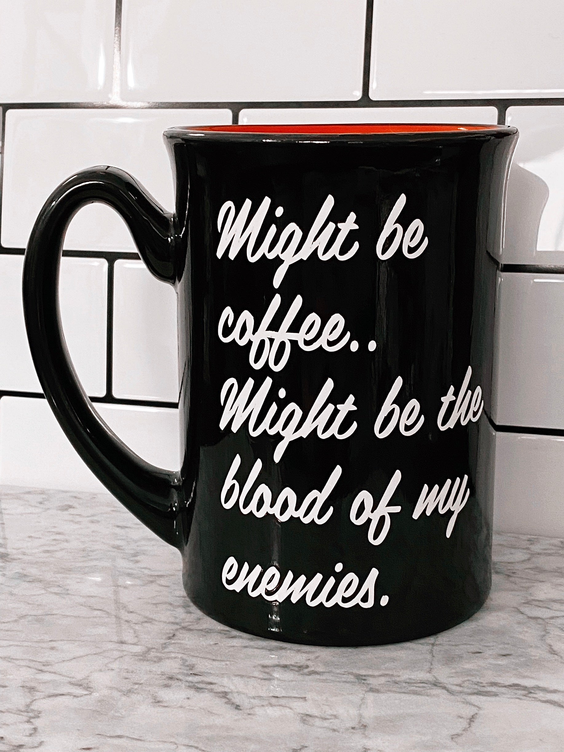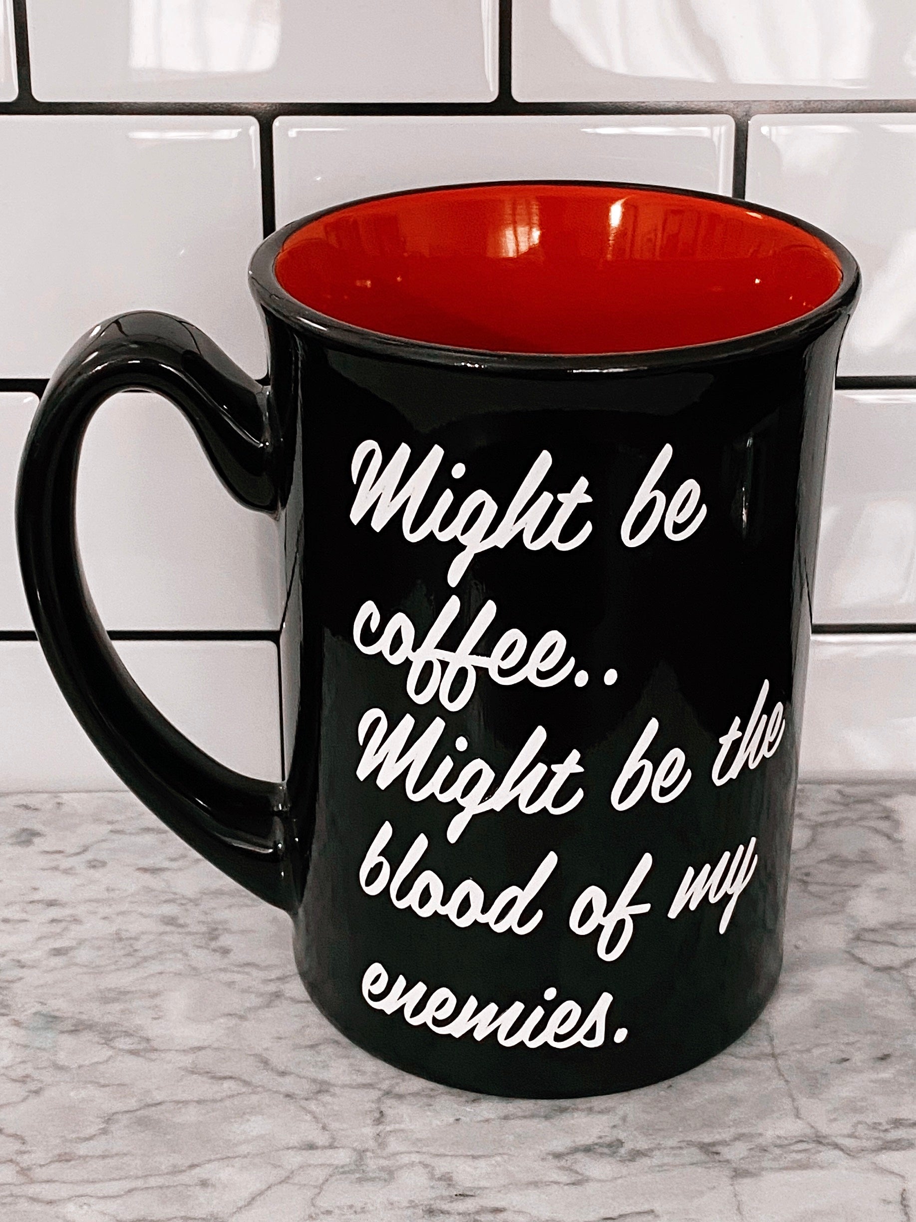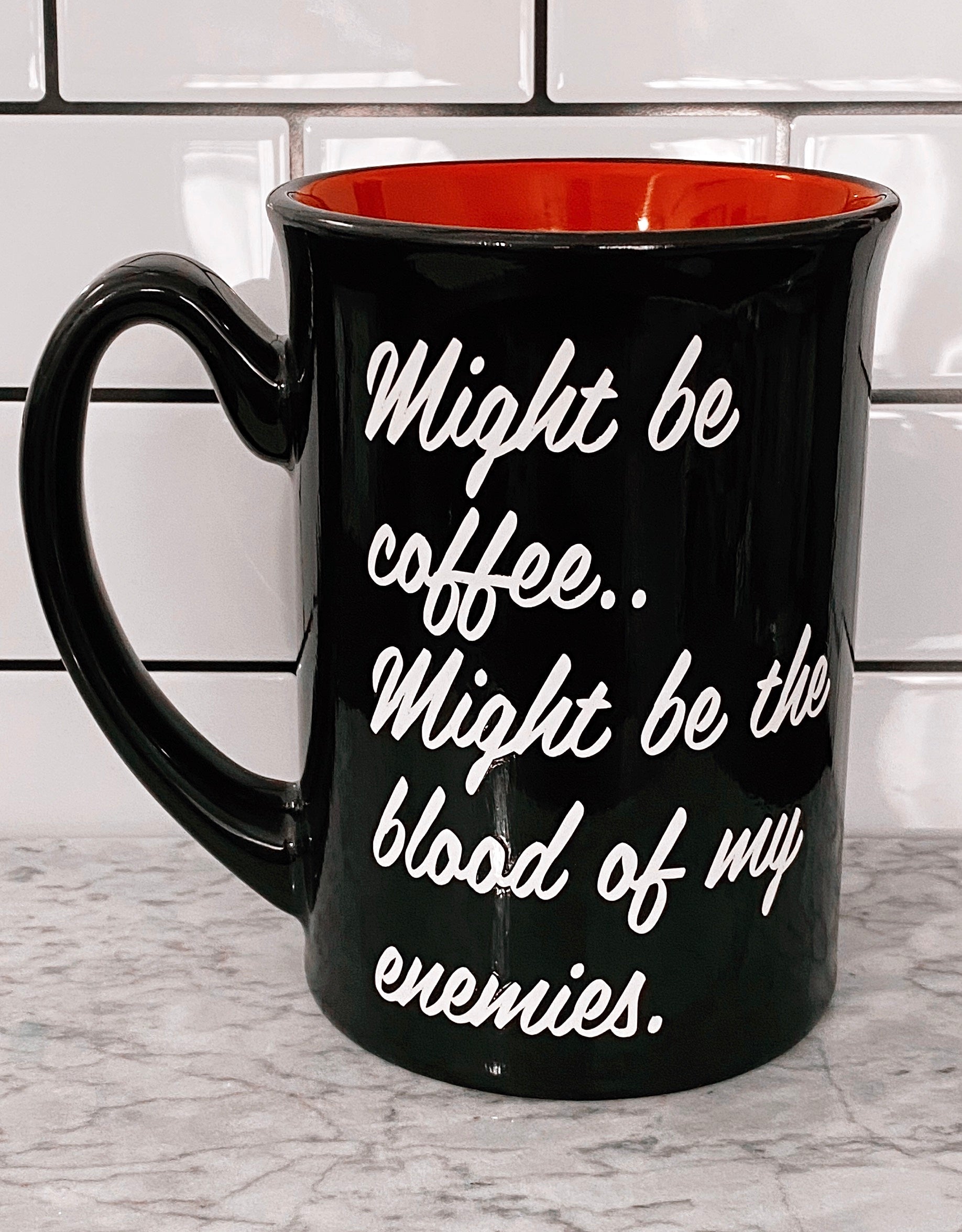 This hand-finished mug holds a whopping 15 oz of whatever liquid you choose. It’s nearly 5” high and 3.5” wide, with a large handle that will comfortably fit both large and small hands. It is finished with immaculately cut vinyl in our original design, painstakingly hand-sealed to be top-rack dishwasher safe. It’s roomy interior is blood red to help camouflage any incriminating contents.