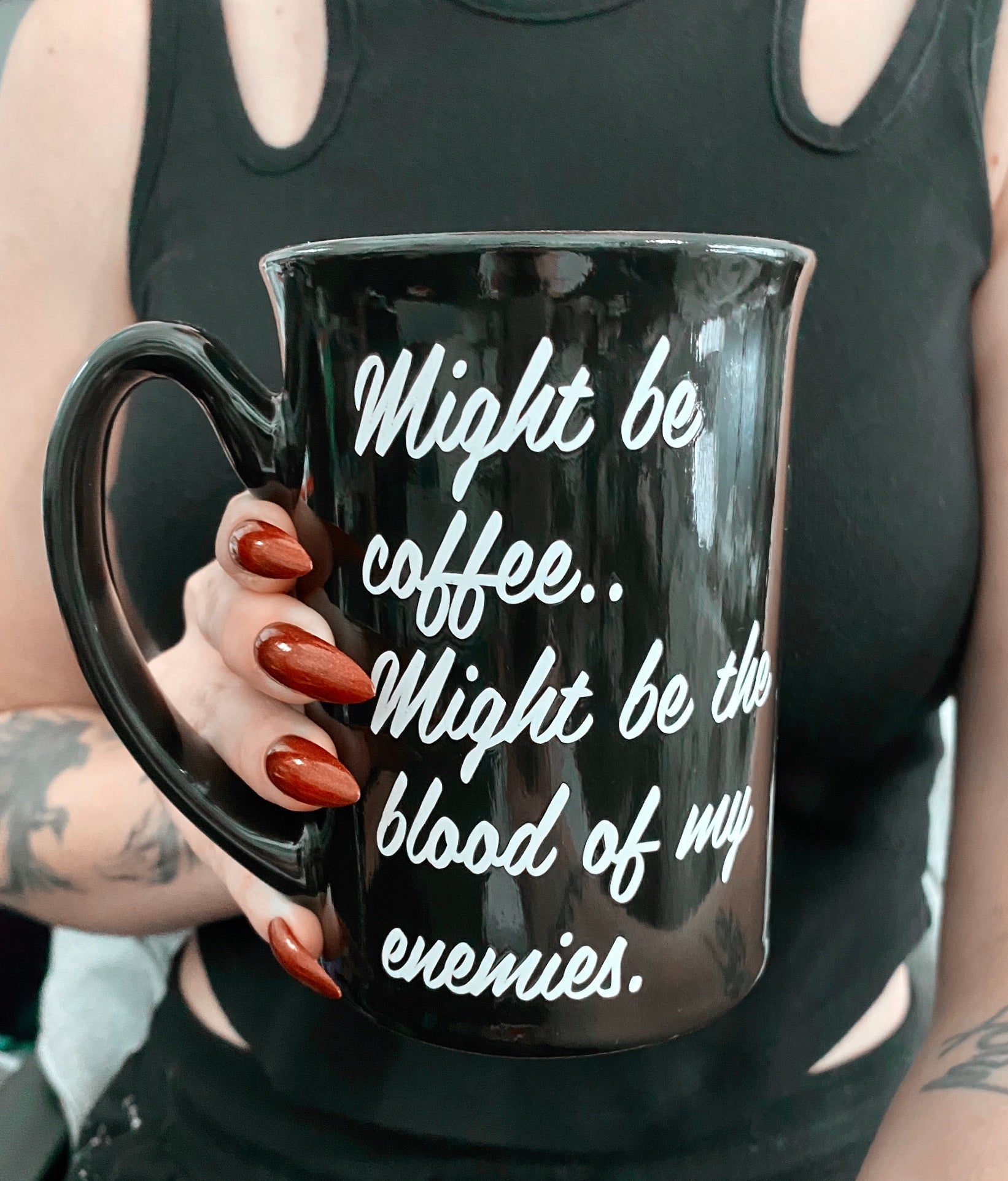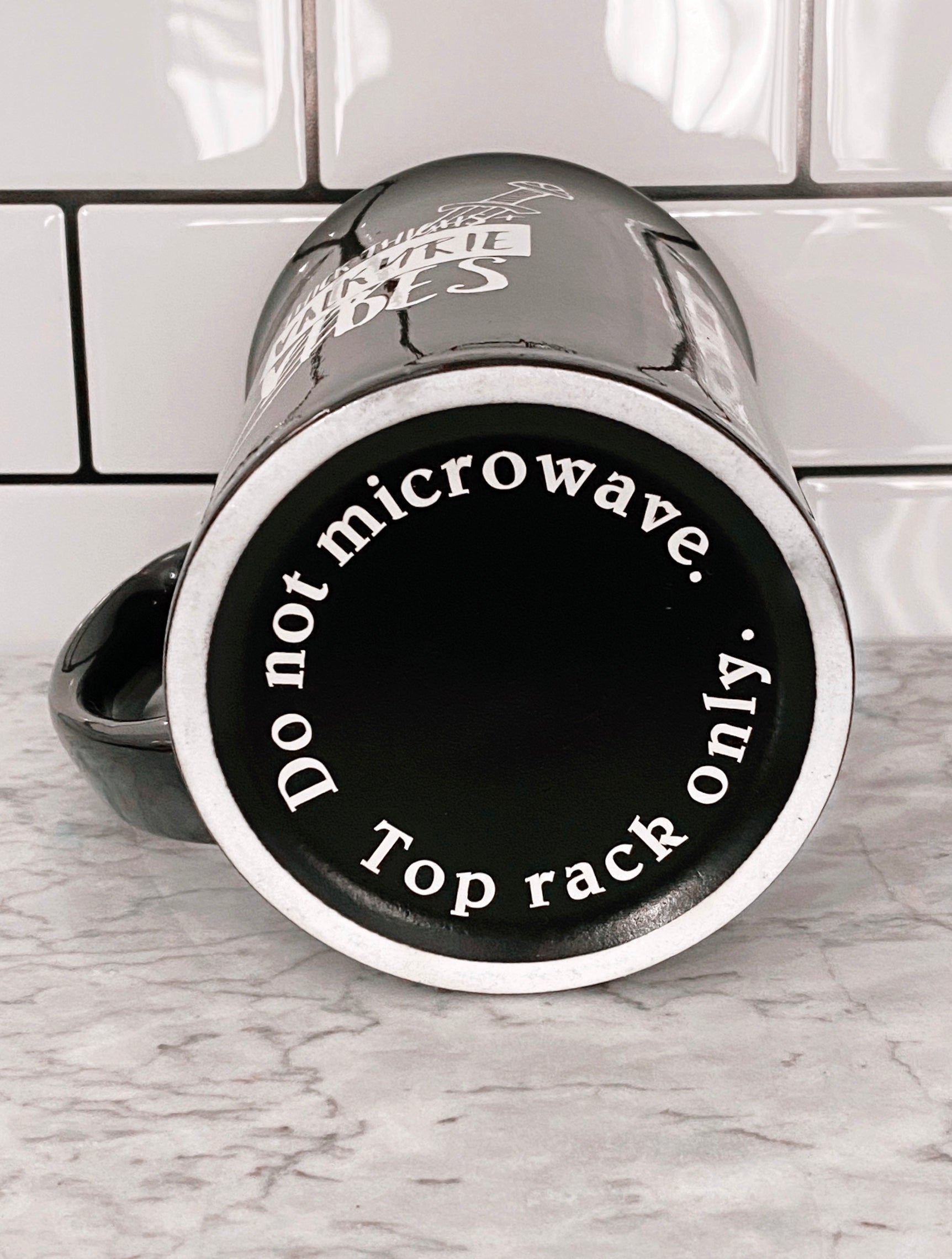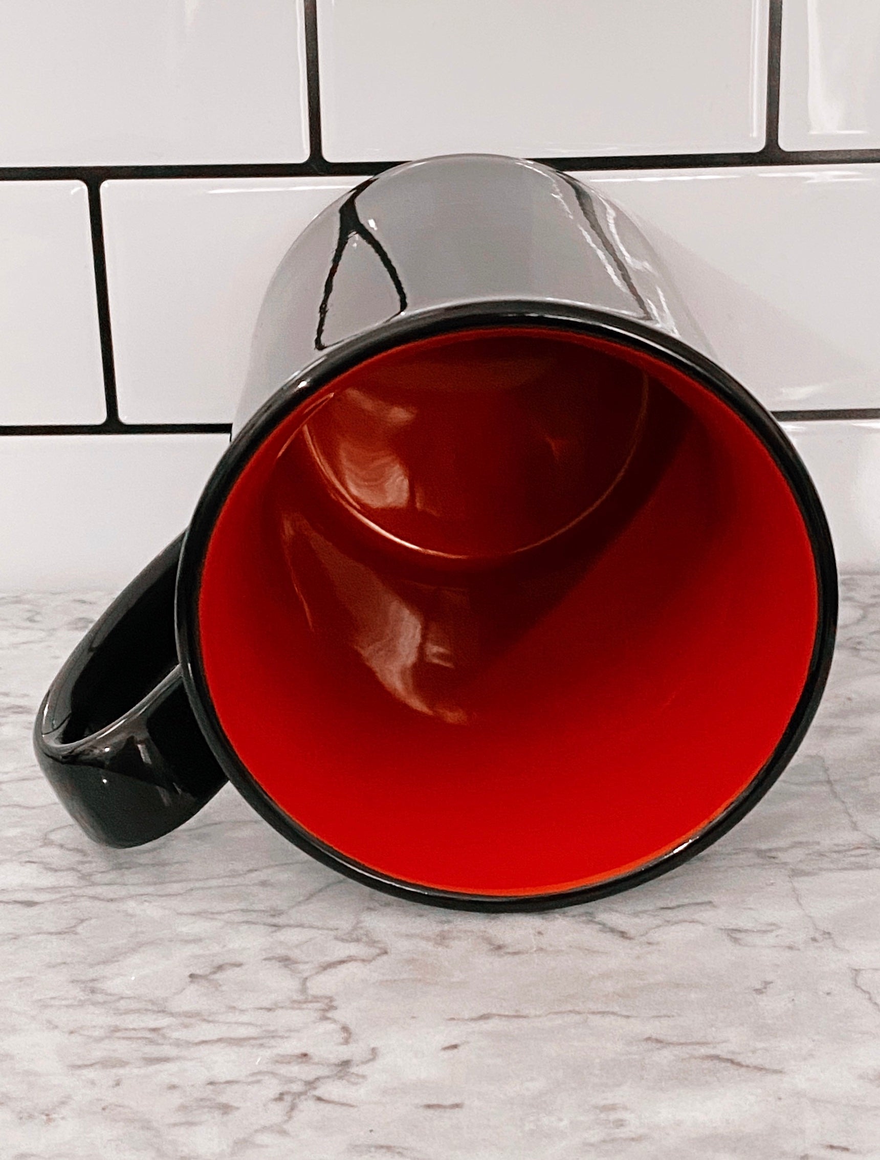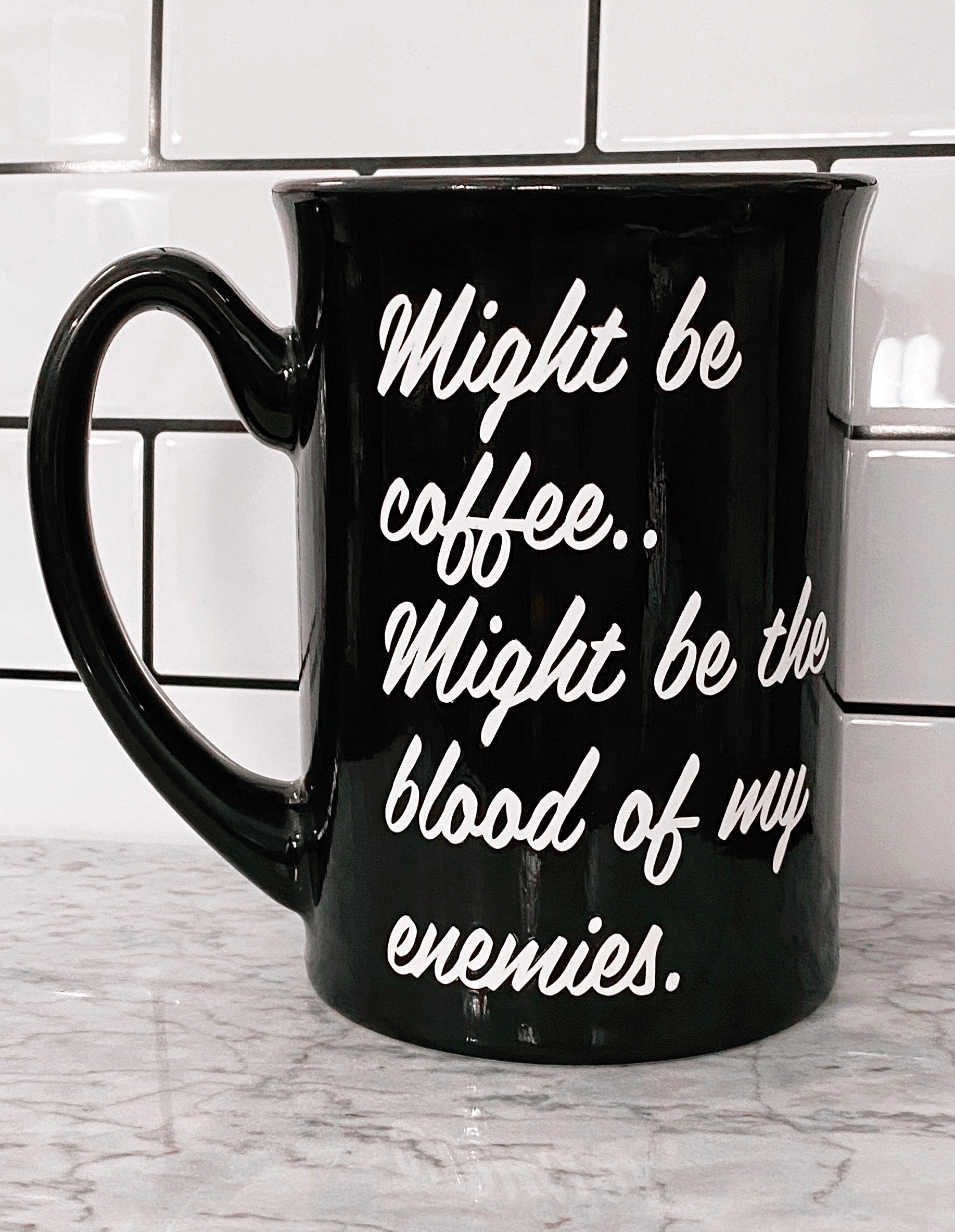This hand-finished mug holds a whopping 15 oz of whatever liquid you choose. It’s nearly 5” high and 3.5” wide, with a large handle that will comfortably fit both large and small hands. It is finished with immaculately cut vinyl in our original design, painstakingly hand-sealed to be top-rack dishwasher safe. It’s roomy interior is blood red to help camouflage any incriminating contents.