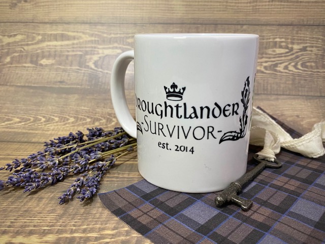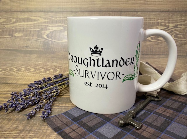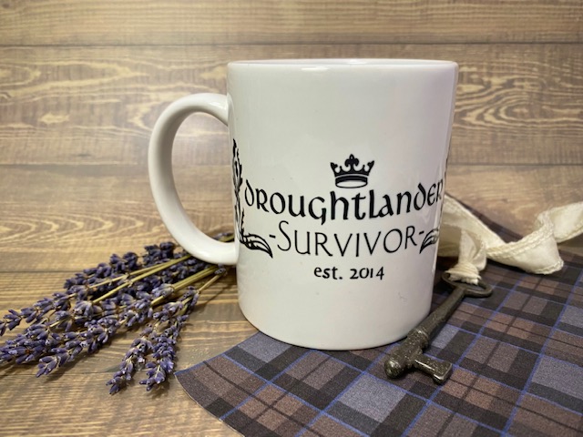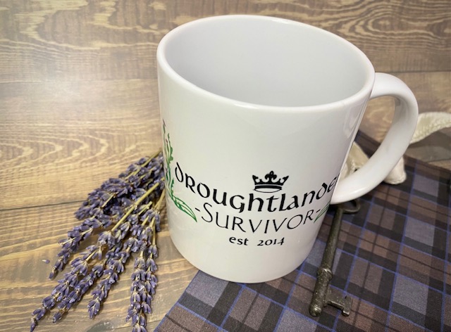 A hand-etched whiskey (or whisky, if you procure your libations from the spirit’s homeland) glass is just the ticket to see you through. This lowball glass is etched with “Droughtlander Survivor est. 2014” with Scottish thistle sprigs flanking either side and a crown on top. A classic, weighted bottom will keep your glass from tipping over.. as long as you don’t tip over with it!